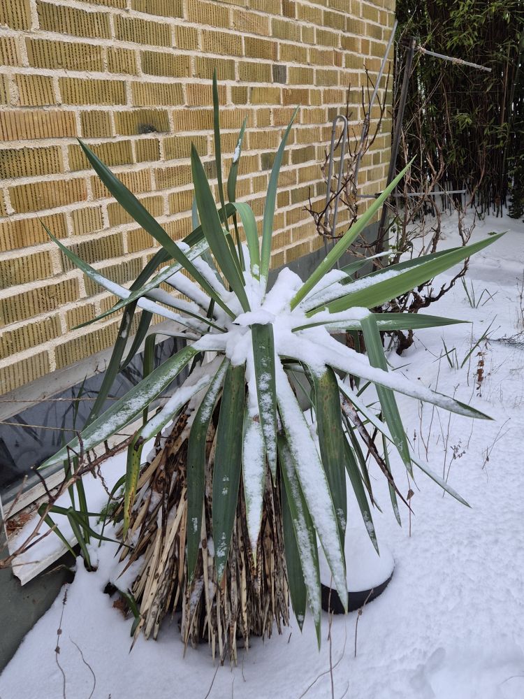 Alla vinterskador beror nog inte på kylan. Min största Yucca gloriosa såg bra ut fram till för några veckor sedan. Plötsligt såg den lite stukad ut och var sned i toppen. Jag misstänker att det kan ha rasat ner snö från taket på den. Jag hade redan tidigare förankrat den i väggen med snören ifall den skulle bli nertyngd av snö. Den har nu möjligen brutits lite där jag har bundit snörena. Å andra sidan, hade jag inte förankrat den så hade nog hela stammen vält.